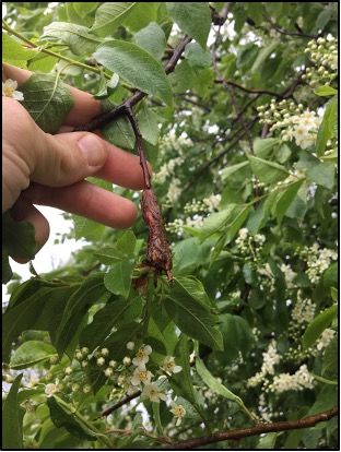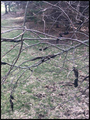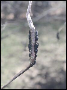 The disease, Dibotryon morbosom, commonly known as Black knot fungus, gets its name from the black and knotty outgrowth it produces. Infection from this fungus occurs in the spring when spores are transmitted from wind or splashed in the rain onto new growth. The fungus disrupts the normal flow of water and nutrients in mainly plum and cherry trees (as well as the rose family) when growing on the branches and stems, causing dieback within the canopy. Black knot is an extremely difficult fungus to detect during the first year of infection as the symptoms are difficult to see. The infection starts as small swelling of the twig or branch tissue (see picture left). This progresses into the larger black “knots” that represent the disease name.
