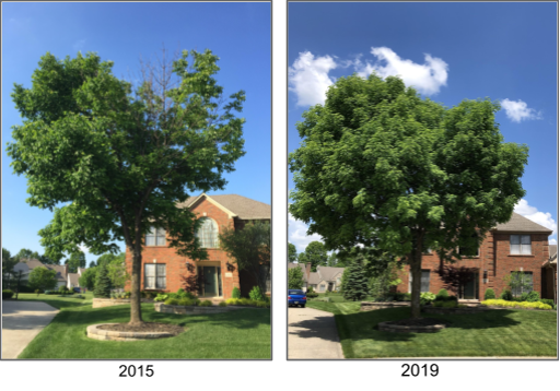 Here is a good example of the difference 4 years made for a very stressed tree. This ash tree had ash borer and chlorosis (a nutrient deficiency). What’s hard to notice from the photos is that the tree in 2019 has about a 15-20% larger canopy with fuller, and thicker leaves.
